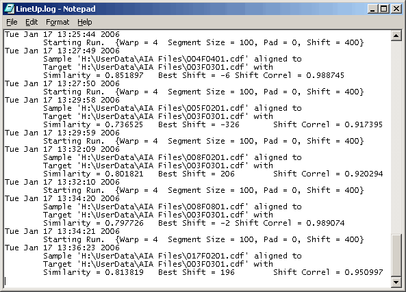 Every sample processed by LineUp has its biography recorded in the log file. Included are the time the analysis was begun, the processing parameters used, which target was compared, and a Similarity value that gives an idea of how well the final aligned profile matches the target.
