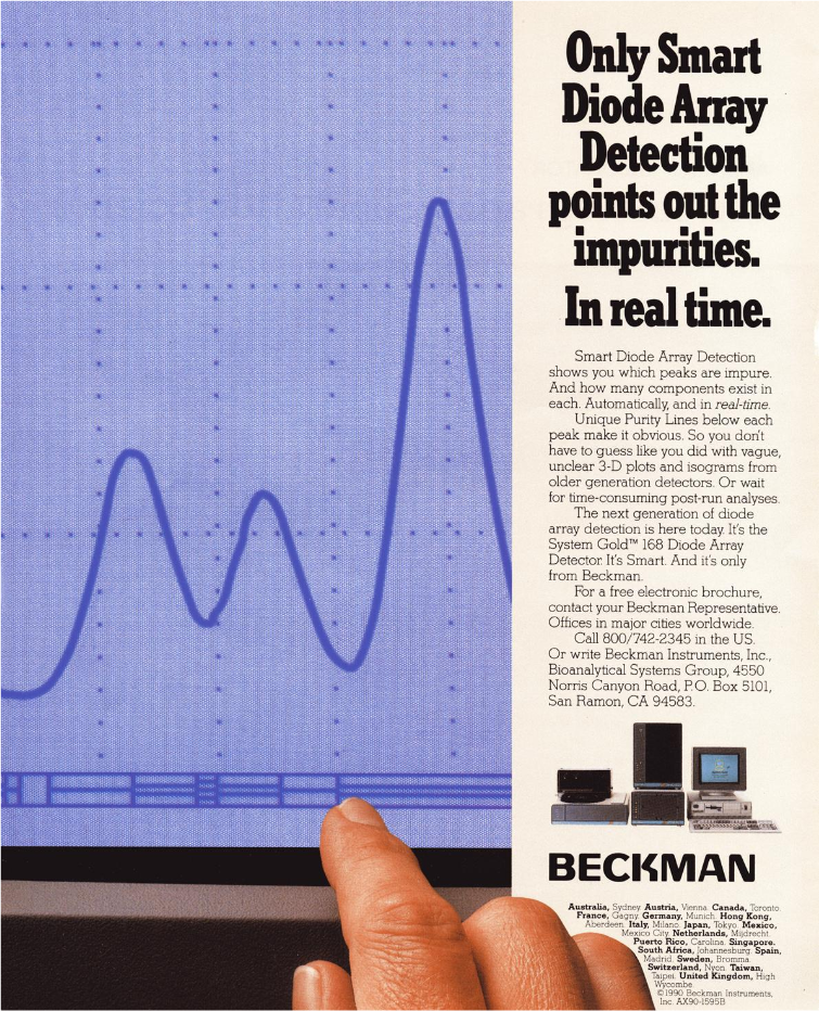 1990 — Beckman Instruments introduced the 168 diode array detector which includes Infometrix’ Real Time Purity. This is the first implementation of chemometrics on a chip (in this case FIEFA, fixed interval evolving factor analysis). |