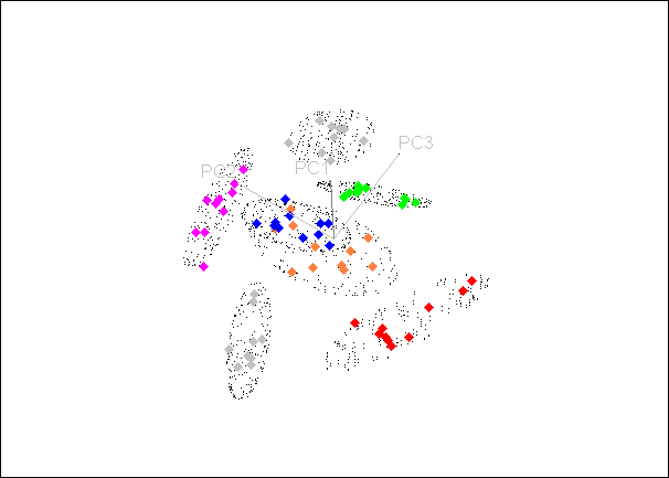 Included in the SIMCA results is a graphic called Class Projections. This presents the scores for every sample projected into a 3-dimensional factor space based on PCA of the whole set. Also shown is a 3-D confidence ellipse for each category. Plots like this are often shown in the literature when describing the SIMCA algorithm. The Pirouette Class Projections are unique in that the are offered as an interactive 3-D plot. You should keep in mind, however, that this plot has drawbacks. First, the projections show only the “in-model” information while membership is based on “out-of-model” information, the residuals. Also, 3 PCA factors of the whole data set do not account for all information in every category; much is left out and cannot realistically be shown in such a view.
