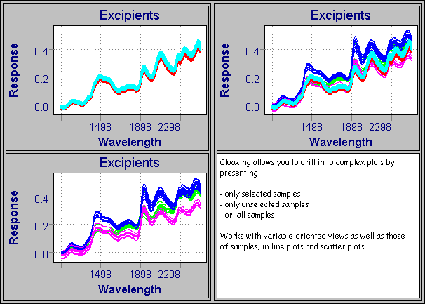 As powerful as dynamic linking is, there are times when there is so much data, that it is hard to see where highlighted samples appear in a sea of samples. Cloaking comes to the rescue. The cloaking button is a 3-way toggle: hit it once to temporarily hide all highlighted samples; hit it a second time to show only the highlighted samples; and, a third time to once again show all samples, highlighted or not. Cloaking can be used on scatter plots or line plots, on plots that are sample-oriented or those that are variable-oriented. Combined with dynamic linking, you can make your selections in one view and see which samples appear in the cloaked view.