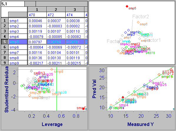 Visualization is a key component in multivariate analysis, and Pirouette makes this easy. In particular, with large data sets, it is critical to know how samples appear in relation to others. A simple way to do this is by “highlighting” a sample to make it stand out (also applicable to groups of samples). In Pirouette, we have taken this to the next step that those in dynamic graphics call linking. A highlighted sample will appear highlighted in all sample-oriented views, whether presented as a table or a graphic. Combined with Cloaking, this is a powerful tool for investigating relationships in your data.