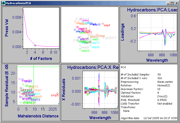 All algorithms in Pirouette are accessed in a common dialog box. Each algorithm, however, offers unique parameters. On the other hand, transformations such as derivatives and scatter correction are applied before algorithm pretreatment and can thus be set globally. What-if analyses are possible by setting up a batch of runs: compare different algorithms (e.g., PCR and PLS) when run with different pretreatments and different transformations, all in a single batch setup.