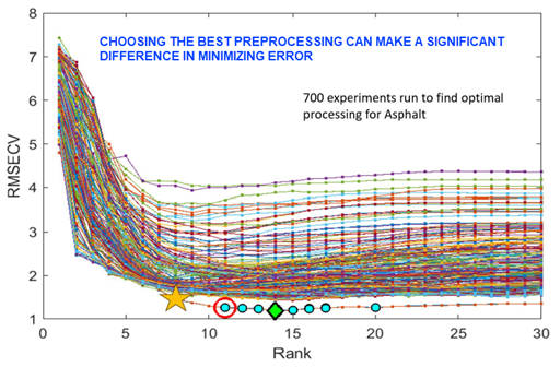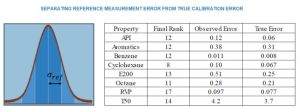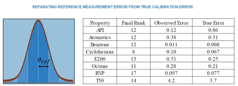 Best practices in the laboratory will include assessing the precision of the reference value. Here, we run a given sample several, even many, times to find the standard deviation of the measurements. Combining this value with the degrees of freedom (essentially the number of repeat assessments) allows you to estimate the actual error in your spectral analysis. As can be seen by comparing the observed error for several petroleum laboratory measurements, the true error is typically between 50 and 75% of the error reported in the calibration step.